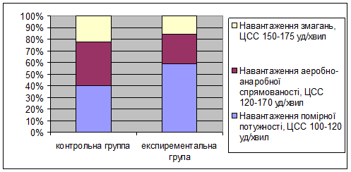Таким чином, між контрольною і експериментальною групами спостерігаються істотні відмінності. Позитивна динаміка в педалюванні у випробовуваних контрольної групи, вочевидь, пояснюється деяким поліпшенням рухливості завдяки заняттям фізичною культурою за звичайною програмою. Оскільки в експериментальній групі увага була акцентована на розвиток як пасивної, так і активної форми педалювання, значніші зміни пояснюються саме ефектом акцентованого розвитку педалювання. Методика проведення занять на акцентований розвиток педалювання описана в розділі "Огляд літературних даних". Оскільки віковий і статевий склад в обох досліджених групах є ідентичним, відмінності в динаміці розвитку педалювання пояснюється особливою методикою проведення уроків фізичної культури, яка позитивно позначається на розвиток такої важливої рухової якості як педалювання. За антропометричними даними індекс Кетле в кінці обстеження у юнаків контрольної групи склав 179 г/см, у юнаків експериментальної групи - 169 г/см. Такі показники масарістового індексу побічно можуть свідчити про вищий рівень педалювання у юнаків контрольної групи. Цей факт також говорить на користь того, що акцентовані заняття на розвиток педалювання позитивно позначаються на антропометричних чинниках, які і визначають рівень педалювання. В.Г. Мінченко і Б.В. Міхайлов експериментально показали позитивний вплив підвищення інтенсивності тренувальних навантажень. Справжня робота розширює і заглиблює вказане методику в підготовці велосипедистів, здатних заповніть в річному циклі об'єм навантажень 220-270 км. У проведеному педагогічному експерименті прийняли участь 18 юнаків-школярів. Спортсмени були розподілені на дві групи, які впродовж 5 місяців експериментального тренування виконували наступні завдання. Контрольна група тренувалася загальноприйнятим способом. Початок експериментального періоду збігався з початком річного тренувального циклу. У грудні, тобто на першому етапі підготовчого періоду, велосипедисти виконували рівномірні навантаження виключно аеробної спрямованості з ЧСС від 130 до 156 уд/хв. У січні і лютому об'єм тренувального навантаження значно збільшився. При цьому аеробна робота склала 80-90% спеціальних завдань, а на долю змішаних нагрузок, куди включався силовий і інтенсивний об'єм (при ЧСС 160-185 уд./хв), доводилося 10-12% загального об'єму. 1-я дослідна група безпосередньо після завершення перехідного періоду, на відміну від контрольної групи, виконала не лише аеробні, але і змішані загрузки. Їх, доля складала в грудні 35%, а в січні і лютому в середньому 43% від загального об'єму кілометражу (див. рисунок 3.1) 2-я дослідна група в порівнянні з 1-ою в грудні виконала більший об'єм загального навантаження при підвищеній інтенсивності завдань. Загальний об'єм соціальної роботи, а також співвідношення аеробних, змішаних, анаеробних і змагань навантажень за березень-квітень у всіх групах був однаковим.