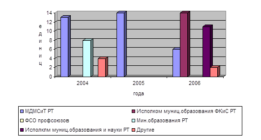 Рисунок 2.6 – Ведомственная принадлежность ДЮСШ в 2006 году Приоритетным направлением физического воспитания в школе является совершенствование уроков физической культуры и внеклассной физкультурно-оздоровительной и спортивной работы; сохранение и укрепление здоровья, формирование навыков здорового образа жизни, физической культуры и спорта. В учебных заведениях города и района охвачено систематическими занятиями физической культурой и спортом 52459 учащихся. В 2006 году была обеспечена соответствующая подготовка и участие молодых нижнекамцев в спортивных мероприятиях по различным видам спорта, так: 107 городских и районных, 76 Республиканских, 23 Российских соревнованиях, 5 Международных. Сборная команда Республики Татарстан успешно выступила и завоевала золотую медаль в Чемпионате России по эстафетному бегу. В составе нашей сборной бежали сильнейшие барьеристы Республики и трое из них - представители спортивного клуба «Нефтехимик»: Манаков Сергей, Гилязов Айдар, Ярушкин Александр. Воспитанники ЦТД приняли участие в ХVI Чемпионате Мира по ракетомодельному спорту (г. Байконур) в составе российской команды, которая заняла 4 место. Воспитанники детско–юношеских спортивных школ футбола и хоккея радуют нас своими успехами не только в Республике, но и в России, и на Международном уровне. На протяжении последних 3 лет сборным командам по вольной борьбе, лыжным гонкам, легкой атлетике, боксу нет равных в Республике. Закономерный результат — Михайлова Наталья: Чемпионка Европы по дзюдо среди кадетов (Чемпионат проходил в Венгрии 23 мая 2006 года). (фотона экране), Косачев Илья двукратный призер первенства России по вольной борьбе, все они воспитанники школы олимпийского резерва с\к (Нефтехимик), Ибятов Радик воспитанник детско-юношеской школы 33 управления по делам молодежи и спорту стал победителем Чемпионата Приволжского федерального округа по армспорту выполнив норматив мастера спорта, Гиниятулли Ильдус Мастер спорта Призер Первенства России по вольной борьбе и Чемпион России по борьбе на поясах. Более 40 нижнекамских спортсменов-воспитанников ДЮСШ являются членами сборных команд Республики Татарстан и привлекаются на Чемпионаты Первенства России. Наряду с положительными результатами образовательные учреждения имеют следующие проблемы: не укомплектованность квалифицированными специалистами физического воспитания из-за низкой заработной платы, недостаточная оснащенность качественным спортивным инвентарем и оборудованием, недостаточное финансирование физкультурно-оздоровительных и спортивных мероприятий учащихся [25, c. 62]. Большая работа проводится по организации спортивно-массовых и физкультурно-оздоровительных мероприятий по месту жительства, в микрорайонах города. Традиционными стали Спартакиады среди работников предприятий, студентов ВУЗов и средне-специальных учебных заведений, общеобразовательных школ и подростковых клубов. Ежегодно проводятся смотры-конкурсы на лучшую постановку спортивно-массовой и физкультурно-оздоровительной работы, определяется «лучший спортсмен», «лучший тренер», «лучший судья» и т.д. Всем известно, что практически любая олимпийская победа начинается с дворовой или школьной площадки. Потому одной из наиболее приоритетных задач в работе Управления по делам молодежи и спорту