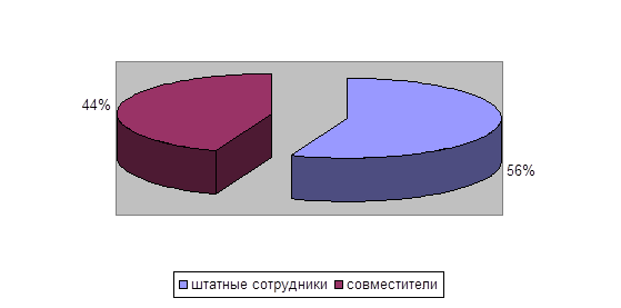 В ДЮСШ и СДЮСШОР Республики Татарстан работают 2891 специалистов: 124 директора, 116 заместителей директора, 127 инструкторов-методистов, 3027 тренеров-преподавателей. Из них 1693 штатных тренеров-преподавателей, что составляет 56 % от общего числа тренерских кадров. В системе Министерства по делам молодежи и спорту РТ работают 1384 тренера-преподавателя, из них 727 штатных (52 %). В системе Министерства Образования РТ – 965 человек, и том числе 557 штатных (57 %) [18, c. 52]. Больший процент штатных тренерских кадров в системе Министерства Образования в определенной степени объясняется тем, что ДЮСШ и СДЮШОР Министерства Образования Республики Татарстан – спортивные школы с многолетним опытом работы и традициями, тогда как подавляющее большинство ДЮСШ и СДЮШОР Министерства по делам молодежи и спорту Республики Татарстан существуют около 3х лет. Немаловажным фактом является и то, что большинство учреждений дополнительного образования Министерства Образования Республики Татарстан осуществляют свою деятельность в городах республики, тогда как ДЮСШ и СДЮШОР Министерства по делам молодежи и спорту Республики Татарстан функционируют не только в городах, но и в сельских районах республики, где наиболее ощутим дефицит специалистов в области физической культуры и спорта [19, c. 58]. Рисунок 2.3 анализирует структуру тренерско-преподовательского состава на 01.01.2007 года.
