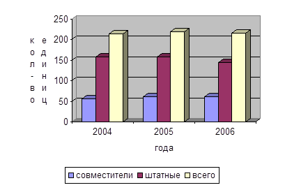 Рисунок 2.5 – Штатный состав сотрудников ДЮСШ и СДЮШОР в Нижнекамском муниципальном районе в 2004-2006 года Целенаправленной подготовкой спортсменов высокого класса и резерва занимаются 13 детско-юношеских спортивных школ города по 28 видам спорта (охват 7103 чел.), из них - З специализированные детско-юношеские школы Олимпийского резерва. Таблица 2.6 – Ведомственная принадлежность ДЮСШ и СДЮШОР