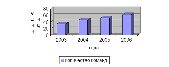 Рисунок 2.7 – Количество команд, принявших участие в соревнованиях на призы клуба «Золотая шайба» в 2003-2006 гг. Городские соревнования на призы клуба «Золотая шайба» проходили с 15 декабря 2005 года по 31 января 2006 года. В них приняли участие 52 команды двух возрастов. В сезоне 2006-2007 года соревнования проходят по трем возрастным группам, где принимает участие рекордное количество команд – 62 из них впервые участвовали 6 команд младшей возрастной группы (1996-1997 г.р.). Планируется установка хоккейных комплексов «Шатлык» на территориях школ № 6 и № 26, приобретение хоккейной амуниции. Важным в работе по увеличению кортов считается расположение их в микрорайонах города и использование для катания на коньках не только дворовыми командами, но и всем населением.