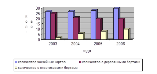 Рисунок 2.8 – Динамика размещения хоккейных кортов в г. Нижнекамске в 2003-2006 гг. В течение зимы, по выходным дням, в свободное от учебы время более 1 000 ребят вели борьбу за право называться сильнейшими в городе и районе и участвовать в финале республиканского Первенства. Финальные соревнования проходили с участием ветеранов хоккея города, родителей и болельщиков. В течение сезона в городе и районе на должном уровне организованы не только финальные соревнования, церемония закрытия, но и телевизионные репортажи с хоккейных кортов города [26, c. 86]. С 2007 года взят старт на развитие хоккея с шайбой среди девочек. В поселке городского типа Камские Поляны сформирована хоккейная команда девочек, которая стала Чемпионом VI Спартакиады учащихся Республики Татарстан в своей группе, а две хоккеистки вошли в состав сборной Республики. Ежегодно увеличивается количество команд участниц городских соревнований на призы клуба «Кожаный мяч». Вновь проводятся популярные соревнования по шахматам «Белая ладья» и оборонно-спортивная игра «Зарница». Вводятся новые формы физкультурно-оздоровительной и спортивной работы: спортивные праздники «Папа, мама, я - спортивная семья», «Веселые старты», «Дни здоровья», военно-спортивные эстафеты, конкурсы, «Спортивно-оздоровительный час – глазами детей», спортивно-массовые игры на городском пляже в загородных оздоровительных лагерях, спортивные праздники в микрорайонах). Большое внимание развитию спортивно–технических видов спорта уделяется в Центре детского творчества (Ракетомодельный кружок - руководитель кружка Россиев Александр Николаевич – МС по ракетомодельному спорту, член Президиума Федерации РМС России, неоднократный призер России этапа Кубка Мира и Международных соревнований, в Центре технического творчества и в подростковых клубах (ПК «Юный техник» посещают более 300 ребят, увлеченных небом. Ребята- авиамоделисты регулярно участвуют в республиканских и всероссийских соревнованиях и всегда занимают только призовые места [26, c. 86]. Говоря о массовых видах спорта нельзя забывать о людях с ограниченными возможностями. Создана и постоянно поддерживается информационная база данных с целью изучения и удовлетворения потребностей и нужд этой категории населения. В городе и районе проживает 11118 инвалидов, из них детей в возрасте до 18 лет 1275 чел. В городской общественной организации инвалидов имеется сектор по спортивной работе с инвалидами, куда входит 85 инвалидов, 11 из них - функциональная группа колясочников. В целях специализации и реабилитации инвалидов разработан ряд мер физкультурно-оздоровительного характера. Для занятия физкультурой и спортом постановлением Главы администрации в 1998 году был принят перечень спортивных зданий и сооружений города, обязанных предоставить залы инвалидам. К таким сооружениям относятся: Дворец спорта «Шинник», спорткомплекс «Дружба», стадион «Нефтехимик», спортзал УП НГМБ, Дворец спорта «Олимпийский» и спортзалы учебных заведений. Инвалиды не чувствуют себя изолированными от общества при проведении физкультурно-оздоровительных мероприятий, активно участвуют в Спартакиадах, Олимпиадах, Первенствах, Чемпионатах, смотрах-конкурсах, показывая и совершенствуя свое спортивное мастерство. Инвалиды участвуют в таких видах соревнований, как гонки на инва
