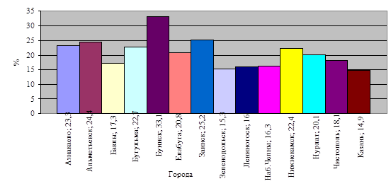Рис.15 - Уровень образованности специалистов в области физической культуры и спорта В области физической культуры и спорта в настоящее время работают 589 человек, специалистов с высшим профессиональным образованием - 47% и имеют средне-специальное образование - 22% от всех работников. Целенаправленной подготовкой спортсменов высокого класса и резерва занимаются 13 детско-юношеских спортивных школ по 28 видам спорта с охватом почти 7 тыс. детей и подростков, а также школа высшего спортивного мастерства спортивного клуба "Нефтехимик". За 2007 год была обеспечена соответствующая подготовка и участие наших спортсменов в 8 международных, 29 всероссийских, 165 республиканских соревнованиях. Проведено 154 различных чемпионатов, первенств и турниров на муниципальном уровне. Под эгидой Управления по делам молодежи и спорту ежегодно проводятся 5 Спартакиад среди различных возрастных групп населения: – среди учащихся общеобразовательных школ по 6 видам спорта; – среди учащихся и студентов средне-специальных учебных заведений и профессиональных лицеев по 13 видам; – среди подростковых клубов по месту жительства по 6 видам; – среди студентов высших учебных заведений по 19 видам; – среди коллективов физической культуры предприятий и учреждений по 23 видам. Всем известно, что практически любая олимпийская победа начинается с дворовой или школьной площадки. Потому одной из наиболее приоритетных задач в работе Управления по делам молодежи и спорту является создание условий занятиями физической культурой и спортом по месту жительства. Большое внимание в Республике, а также в нашем городе и районе, уделяется развитию футбола и хоккея с шайбой. Уже 3 года работает Республиканская программа развития детского хоккея [26, c.63]. В целях организации досуга, профилактики и предупреждения правонарушений среди детей и подростков руководством города совместно с руководителями предприятий и учреждений уделяется особое внимание занятости детей и подростков в летние и зимние каникулы. По инициативе и на средства Нижнекамского муниципального района по месту жительства работает 30 тренеров. В обязанности тренера входит ведение учебно-тренировочной и воспитательной работы среди детей и подростков микрорайона (летом - футбол, зимой - хоккей с шайбой, в межсезонье - флорбол). В работе по месту жительства особое внимание уделяется детям из неблагополучных семей и, состоящих на учете в комиссии по делам несовершеннолетних (КДН). Тренера стараются заинтересовать детей "группы риска" к регулярным занятиям спортом. На данный момент 43 ребенка, состоящих на учете в комиссии по делам несовершеннолетних, занимаются в дворовых командах. Нижнекамск всегда славился спортивными традициями, и большая заслуга в этом принадлежит тесному взаимодействию в организации физкультурной и спортивной работы между всеми спортивными учреждениями, независимо от ведомственной принадлежности. Это яркий пример социального партнерства. Особое внимание в своей деятельности Управление по делам молодежи и спорту г. Нижнекамска и Нижнекамского муниципального района уделяет работе с инвалидами. В этом направлении осуществляется тесное сотрудничество с управлениями здравоохранения и социальной защиты населения, а также с обществом инвалидов и спортивным комплексом "Шинник". Создана и п