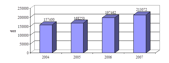 Рис.2 - Численность занимающихся физической культурой и спортом в городах Республики Татарстан Активизировалась работа по привлечению к занятиям физической культурой и спортом коллективов физической культуры (КФК) предприятий различных форм собственности. В 46 спортивных мероприятиях, турнирах и Чемпионатах проводимых ФСО "Спартак-Татарстан" в течение года приняли участие 196 КФК четырнадцати отраслей с общим охватом 6027 чел. (в 2006 году 159 КФК с охватом 5633 чел) [26, с.36].