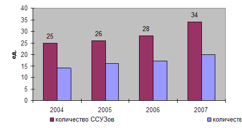 Рис.5 - Количество ССУЗов и ВУЗов, принимавших участие в Спартакиадах Клуб является координатором работы и по месту жительства: в общежитиях функционируют спортивные залы, оборудованные тренажерами и спортинвентарем, проводится ежегодная универсиада общежитий. В Рамках Года Благотворительности был проведен Всероссийский турнир по мини-футболу среди детских домов ПФО, в котором принимали участие 10 команд из регионов и республик округа. Команда РТ заняла второе место. Проделана значительная работа по продвижению г. Казани в качестве кандидата на проведение Универсиады 2013 г. На Универсиаде, прошедшей в Бангкоке в августе 2007 года, спортсмены Татарстана завоевали 3 золотые, 2 серебряные, 3 бронзовые медали по таким видам спорта, как баскетбол, спортивная гимнастика, легкая атлетика, стендовая стрельба. Развитие детско-юношеского спорта в республике является важным средством воспитания и формирования личности, эффективным способом профилактики социально-негативных явлений в подростковой среде. В настоящее время в республике функционирует 159 учреждений дополнительного образования детей физкультурно-спортивной направленности, из них 143 ДЮСШ (в том числе 33 специализированные) и 15 детско-юношеских клубов физической подготовки. Общий охват занимающихся в учреждениях дополнительного образования по физической культуре и спорту составляет 113179 человек, из них в ДЮСШ и СДЮШОР - 97 021 чел. В настоящее время в учреждениях дополнительного образования физкультурно-спортивной направленности республики проводятся занятия по 65 видам спорта.