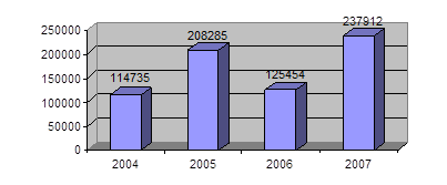 Рис.8 - Количество спортсменов РТ, принявших участие в международных, российских и республиканских соревнованиях Республика Татарстан в 2007 году стала местом проведения крупнейших международных и всероссийских соревнований. Наиболее значимые из них: – Матчи мировой лиги по волейболу. – Чемпионат Европы по хоккею на траве. – Соревнования Супер Кубок Европы по настольному теннису. – Международные турниры по художественной гимнастике и гиревому спорту, – Соревнования III летней Спартакиады учащихся ПФО по волейболу, баскетболу, легкой атлетике, художественной гимнастике, дзюдо, греко-римской борьбе, фехтованию, академической гребле. – Финальные соревнования III летней Спартакиады учащихся России по водному поло, академической гребле, гребле на байдарках и каноэ, стендовой стрельбе, хоккею на траве, фехтованию, шахматам. – Чемпионат России по национальной борьбе. – Этап Кубка России по горнолыжному спорту. – Этап Кубка России по стендовой стрельбе. – Первенство России по водному поло. – Всероссийские юношеские соревнования по хоккею с шайбой. – Всероссийские турниры по боксу, кикбоксингу, армейскому рукопашному бою, греко-римской борьбе, борьбе на поясах, конному спорту, парусному спорту, спортивным танцам, лыжным гонкам, стендовой стрельбе, теннису, настольному теннису, хоккею с шайбой, фехтованию, фигурному катанию, шахматам. Татарстанские спортсмены, команды мастеров достойно выступали на всероссийских и международных соревнованиях, укрепляя спортивный имидж нашей республики. В 2007 году ими было завоевано 768 медалей (539 медалей в 2006 году), из них золотых - 286 (181 - в 2006г.), серебряных - 226 (186 - в 2006 г.), бронзовых - 256 (172 - в 2006 г.) [26, с.18].