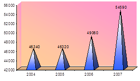 Рис.3 - Количество занимающихся физической культурой и спортом на предприятиях РТ Физкультурно-оздоровительная и спортивная работа среди трудоспособного населения проводится в 1110 КФК и охватывает 213072 чел. В 110 КФК работают штатные инструктора по физической культуре и спорту, а в остальных назначенные руководством на общественных началах, что значительно усложняет работу. В 2007 году было подписано совместное "Положение о проведении Спартакиады "Здоровье-2007" с Федерацией профсоюзов РТ и Министерством по делам молодежи, спорту и туризму Республики Татарстан. В 2007 году были проведены соревнования "Молодежная лыжня - 2007", где участвовали команды 12 отраслей по трем возрастным группам. В сентябре 2007 года состоялась Спартакиада среди работающей молодежи Республики Татарстан. В целях привлечения сельского населения к занятиям физической культурой и спортом проводятся спортивные мероприятия, чемпионаты и первенства среди спортсменов из сельских муниципальных районов. В г. Мамадыш прошел Финал V летних сельских спортивных игр РТ "Авыл Яшьлере", в котором приняли участие команды из 40 муниципальных районов РТ (500 человек). В программу финала вошли соревнования по 10 видам спорта. В зональных соревнованиях, которые проводились в течение всего года, приняло участие более 1500 участников из сельских районов. Сельские спортсмены Татарстана ежегодно принимают участие во Всероссийских зимних и летних спортивных играх. Команда Республики Татарстан приняла участие в III Всероссийских зимних сельских спортивных играх, проходивших в г. Омск, где в командном первенстве в своей группе заняла 5 место. В целях привлечения к занятиям физической культурой и спортом людей с ограниченными возможностями, их социальной адаптации, реабилитации средствами физической культуры и спорта ФСО инвалидов Республики Татарстан проводит в этом направлении целенаправленную физкультурно-оздоровительную работу. В 2007 году проведены 10 Чемпионатов Республики Татарстан по настольному теннису, пулевой стрельбе, легкой атлетике, туризму, армспорту, русским шашкам, международным шашкам и шахматам, греко-римской и вольной борьбе. В муниципальных районах республики были проведены спортивные мероприятия, посвященные Декаде инвалидов. В финальных соревнованиях Чемпионатов Республики Татарстан по видам спорта приняли участие более 600 человек из 20 городов и районов Татарстана. По итогам Всероссийского смотра-конкурса на лучшую постановку физкультурно-оздоровительной работы в 2007 году общественная организация "Физкультурно-спортивное общество инвалидов Республики Татарстан" заняла 1 место [27, с.23]. В 2007 году наблюдается увеличение количества студентов, регулярно занимающихся физической культурой и спортом. По сравнению с 2006 годом процент охвата студентов спортивно-оздоровительными мероприятиями увеличился на 2,1% и составляет 19,2% от общего числа студенчества. На рисунке 4 отражена динамика занятия студентов физической культурой и спортом. Из данной диаграммы очевидно, что наибольший всплеск участия студентов в занятиях физической культурой и спортом произошел в 2005 году. Однако, в последующие годы увеличение количества занимающихся спортом студентов хотя и было, но уже незначительное.