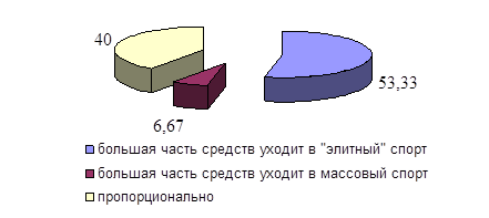Рис. 19 - Мнение респондентов о соответствии материально-технической базы образовательных учреждений и дворовых клубов Кроме того, респондентами отмечается, что большая часть денежных средств расходуется на финансирование "элитных" видов спорта, таких, как хоккей и футбол, оставляя на развитие массовых видов спорта лишь незначительную часть (рисунок 20).