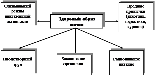 Рис 2. Основные компоненты здорового образа жизни. На современном этапе развития нашего общества многие ученые выделяют и другие компоненты ЗОЖ. Так, Дуркин П.К., Лебедева М.П. (2002) выделяют в своих работах потребностно-мотивационный компонент. Потребность в движениях, в физическом совершенствовании, в сохранении и укреплении здоровья – вот психологические основы мотивации формирования здорового образа жизни. По данным Бальсевича В.К., Лубышевой М.П. (1994, 1995) основным компонентов ЗОЖ является личная физическая культура. Это часть культуры личности, основу специфического содержания которой составляет рациональной использование человекам одного или нескольких видов физкультурной деятельности в качестве фактора оптимизации своего духовного и физического состояния (Лубышева М.П., 1992). По мимо этих основных компонентов в системе формирования ЗОЖ многими учеными выделяется еще и образовательный компонент как учащихся, так и учителей и родителей (Лукьяненко В.П., 2000, Трещева О.Л., 2001, Абаскалова Н.П., 2000, Соловьев Г.М., Прокопенко Т.И. 2001), котором можно выделить следующие основные знания: - о влиянии наследственности на индивидуальном развитии человека; - о роли семейного воспитания и уклада на формирование образа жизни будущего поколения; - о целенаправленном применении разнообразных форм физической культуры; - о целенаправленном освоении гигиенических навыков и навыков охраны здоровья; - об использовании естественных природных факторов в укреплении здоровья (закаливание) и цивилизованное отношение к природе; - активная пропаганде по внедрению ЗОЖ в жизнь каждого человека и общества. Именно этот образовательный компонент, на наш взгляд, и лежит в основе обучения, привития и формирования у подрастающего поколения основных принципов, форм и факторов ЗОЖ. Таковы основные слагаемые ЗОЖ. Однако весь парадокс в том, что для очень многих людей они ещё не стали руководством к практическим действиям. Внедрение их в повседневную жизнь людей требует комплексного подхода, кропотливой целенаправленной деятельности со стороны многих государственных учреждений и организаций. Поэтому оно предполагает, прежде всего, активную деятельность в этом направлении самого человека. Следование нормам и принципам ЗОЖ - долг каждого разумного человека Сознательное отношение к собственному здоровью должно стать нормой поведения, главной отличительной чертой культурной, цивилизованной личности. 1.3.1. Плодотворный труд Плодотворный труд – развитие и формирование основных умений и навыков трудовой деятельности и реализация их в процессе жизни является главным составляющим здоровья человека (Марков В.В., 2001). Стремительный прогресс производственных технологий, снижение доли физического труда в быту, значительное интеллектуальное, эмоциональное и психологическое напряжение рабочей деятельности в условиях резкого снижения физической активности, этого главного у предшествующих поколений регулятора состояния и функций организма человека, обнаружили со всей остротой дефицит физической культуры большинства населения (.Бальсевич В.К, 1988). В последние годы в организации жизни детей в общеобразовательных учреждениях наблюдается тенденция к значительному увеличению учебно-воспитательной работы. Умственный труд вытесняет постепенно физический. Бол