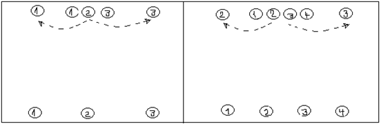 Рис. 3 Смыкание производится в обратном порядке по команде «Дугами вперед сомкнись!». Размыкание дугами назад: по команде «От середины, дугами назад на интервал два шага разомкнись!» вторые и третьи, третьи и четвертые) номера на счет «раз-два» поворачиваются кругом и на пять счетов выходят по дуге на интервал два шага от первых и четвёртых номеров, на «шесть» — приставляют ногу. Размыкание круга в два круга: необходимо рассчитать занимающихся по три, затем по команде «В два круга шагом — марш!» вторые номера делают два (три, четыре и т.д., в зависимости от предварительной условности) шага вперед; третьи номера делают полшага вправо (рис. 4).