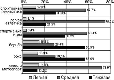Рисунок 3.3. Количество травм на каждые 1000 спортсменов в различных видах спорта (3. С. Миронова и Л. 3. Хейфец, 1965) На занятиях, на которых по каким-либо причинам отсутствует тренер или преподаватель, спортивные травмы встречаются в 4 раза чаще, чем в присутствии преподавателя или тренера, что подтверждает их активную роль в профилактике спортивного травматизма. 3.2. Сравнительный анализ травматизма в различных видах спортаПроанализируем уровень травматизма в вольной и греко-римской борьбе по сравнению с другими видами спорта. Данные для анализа возьмем из статистики по спортивному травматизму. В.К. Добровольский и В.А. Трофимов показывают, что легкие травмы составляют 91,1%, средние -7,8% и тяжелые 1,1% всех повреждений. Интересные данные приводят 3.С. Миронова и Л.3. Хейфец, отражающие распределение травм по степени тяжести для некоторых видов спорта (Рис. 3.4.).