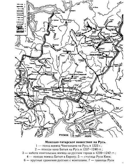 Накануне битвы монголо-татары попытались расколоть союз русских и половцев. Прибывшие к великому киевскому князю послы уверяли, что хан их с русскими никакой вражды не имеет и пришли они не на русские земли, но имеют войну с половцами, конюхами монголо-татар. На совете русских князей решено было не соблазняться этим предложением, коварство которого являлось слишком очевидным. Первое столкновение с авангардными силами монголов объединенные русско-половецкие полки выиграли. Ибн ал Асир сообщил, что "возгорелось в урусах и кипчаках желание разбить татар: они думали, что те отступили из страха и по слабости, не желая сражаться с ними, и поэтому стремительно преследовали татар. Татары все отступали, а те гнались по следам 12 дней". Но это была уловка татар. Не дав русским и половцам приготовиться к битве, они развернули против них свои основные силы и перешли в наступление. Битва на реке Калке 31 мая 1223 г. закончилась сокрушительным поражением русских и половцев. Несогласованность действий князей-сюзеренов, неодновременное вступление в бой русских полков, отсутствие стойкости половцев имело губительные последствия. Не спасли положения храбрость и героизм русских воинов (особенно отличился 18-летний галичский князь Данило Романович). В битве на Калке погибло шесть князей, по летописным данным, из простых воинов вернулся только каждый десятый, а количество убитых киевлян достигло 10 тыс. Битва на Калке стала переломным моментом в история Руси. Она не только значительно ослабила силы русских княжеств, но и посеяла на Руси панику и неуверенность. Не случайно летописцы все чаще отмечают загадочные явления природы, считая их знамением будущих несчастий. В памяти русского народа битва на Калке осталась как трагическое событие, после которого "Русская земля сидит невеселая". Народный эпос именно с ней связывал гибель русских богатырей, отдавших жизнь за Родину. Большие потери понесли в этой битве и монголы. Дойдя до Новгорода-Святополча на Днепре и разрушив по пути поросские и поднепровские города-крепости, они не решились идти на Киев и повернули назад. Не исключено, что продолжение похода на запад еще не входило в планы Чингизхана. После смерти Чингизхана власть перешла к его сыновьям. Великий хан Угедей и его ближайшие советники разработали план новых завоеваний. На курултае 1235 г., согласно свидетельству персидского историка Джувейни, "состоялось решение завладеть странами Булгара, Асов и Руси, которые находились по соседству становища Бату, не были еще покорены и гордились своей многочисленностью". Общемонгольский поход на запад должен был возглавить внук Чингизхана Батый, в помощь которому придавались силы большинства чингизидов - Менгу-хана, Гююк-хана, Бучека, Кулькана, Монкэ, Байдара, Тунгута, Бюджика и даже Субедея, одного из "четырех свирепых псов Чингизхана", отозванного из Китая. В течение осени 1236 - весны 1237 г. монголо-татары завоевали Волжскую Булгарию. Русский летописец так прокомментировал это событие: "Тое же осени придоша от восточные страны в Болгарьскую землю без-божнии Татары, и взяша славный Великый город Болгарськии и избиша оружьем от старца и до унаго и до сущаго младенца, и взяша товара множество, а город ихъ пожгоша огнем, и всю землю ихъ плениша". К осени 1237 г. монгольские "облавы" прошли по землям кипчаков и аланов,