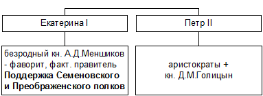 1725-1727 гг. – Екатерина I. Верховный тайный совет: А.Д.Меншиков, Ф.М.Апраксин, Г.И.Головкин, П.А.Толстой, А.И.Остерман, Д.М.Голицын + голштинский герцог Карл Фридрих[1] . П.А.Толстой пытался выступить против Меншикова Þ сослан на Соловки и умер там же. Петр II 1727 г. – Екатерина I подписала тестамент[2] . Ближайший наследник – Петр II. ® дочери Петра: Анна + наследники ® Елизавета + наследники и т.д. 1727-1730 гг. – Петр II, 12 лет + регентство Верховного тайного совета. Меншиков обвенчал Петра II и свою дочь Марию, но Меншиков заболел, а А.И.Остерман (воспитатель Петра II) сместил его. Меншиков арестован, лишен наград, состояния, выслан в г. Березов (Тюменская обл.). Умер в 1729 г. Изменения в Верховном тайном совете. 4 князя Долгоруких, 2 князей Голицыных + интригант А.И.Остерман. Иван Долгорукий – ближайший друг Петра II. Екатерина Долгорукая, сестра Ивана – «государева невеста». 15-летний Петр умер в день назначенной свадьбы. Нет наследников по мужской линии. Заговор верховников Выбор верховников – старшая линия династии, связанная с братом Петра Великого Иваном V. Выбор: курляндская герцогиня Анна Иоанновна, т.к. не имела политических связей с русским дворянством выработали кондиции, по которым АИ не могла выйти замуж без участия Совета АИ не имела права назначать наследника без участия Совета АИ должна была решать важные государственные дела только с Советом Þ императрица = послушная кукла в руках верховников. 2 точки зрения: поражение верховников = неудавшаяся попытка перейти к ограниченной монархии общество тяготело к абсолютизму в России По прибытии в Москву Анны Иоановны пришло более 20 петиций от дворян. Главная мысль: “царствовать неограниченно и самодержавно”, “присланные вашему императорскому величеству и подписанные вашею императорскую рукою пункты уничтожить”. Через 2 недели разорвала кондиции на глазах у верховников. Иван Долгорукий казнен (тайное завещание о занятии престола сестрой, “государыней-невестой”. Отец, жена (Наталья Долгорукая - урожденная Шереметева, превосходила их подвиг преданности - уехала с мужем в Сибирь от роскоши двора) и сестра сосланы в Березов. 1731 г. Верховный совет заменен Кабинетом из 3 министров Глава – А.И.Остерман 1735 г. – 3 подписи кабинет-министров = 1 подпись Анны Иоанновны. Бироновщина. 1730-1740 гг. – Анна Иоанновна. Мало интересовалось государством, некрасива, неумна, необразованна. С 1737 г. всем занимается фаворит – герцог Курляндский Эрнст Иоганн Бирон – честолюбивый, но ограниченный человек. Бироновщина – засилье иноземцев в управлении страной Все ключевые позиции в стране – у немцев. Иностранные дела – Остерман, армия – Миних, гвардия – Левенвольде. Авантюристы безнаказанно разворовывают богатства страны, разрушают экономику (Шемберг, заводы Урала). В исторической науке - появление "норманнской теории" (Байер, Миллер, Шлецер) Антинациональная политика Бирона = недовольство в кругах русского дворянства. 1738 - неудачная попытка потомка знаменитого по Куликовской битве Боброка-Волынского - Артемия Волынского организовать заговор против Анны Иоановны и Бирона = неудача. Он и сподвижники казнены. Символ правления = Тайная канцелярия (А.И.Ушаков). выступления против императрицы государственные преступления («слово и дело») Дворяне борются за привилегии. Абсолютистское государство - навстречу (сохранение мира). Возоб