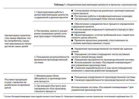 Рис. 1 Данная таблица представляет собой карту, в которой отражены направления поиска новых возможностей для совершенствования работы строительных организаций в области максимизации ценности для потребителей. Публикации на эту тему раскрывают и детализируют способы улучшения работы по конкретному направлению. Разумеется, в рамках одной статьи невозможно осветить все вопросы, поэтому выделим наиболее принципиальные моменты. Вопрос о максимизации ценности, создаваемой в проекте, актуален прежде всего на этапах прединвестиционной, предпроектной подготовки строительства. Именно на этих этапах выясняют, что конкретно требуют заказчики и другие заинтересованные стороны, а результаты этого анализа фиксируют в соответствующей документации (вплоть до рабочих чертежей). Эти моменты могут показаться очевидными, но есть большое количество нюансов, которые далеко не всегда учитывают в практической деятельности. Во-первых, максимизация ценности затруднена из-за того, что у любого проекта строительства, как правило, имеется большое количество заинтересованных сторон: заказчик, инвестор, генподрядчик, подрядчики, генпроектировщик, поставщики, эксплуатирующие органы, местные объединения и граждане и многие другие. Возникает вопрос: на чьи интересы должны сделать акцент участники проекта? Первый приходящий в голову ответ: максимизировать нужно ценность для организации, которая непосредственно платит деньги данному участнику. Однако практический опыт показывает, что это приводит к субоптимальному функционированию всей расширенной строительной организации. Иными словами, за те же деньги можно было бы создать бо льшую ценность для всех участников проекта или ту же ценность при меньших затратах. Так возникает задача согласования интересов участников проекта. На практике этого достигают посредством организации определенных процедур взаимодействия и применения ряда инструментов, которые предполагают высокий уровень доверия участников, раскрытия информации, иногда конфиденциальной. Ясно, что в ряде случаев такое взаимодействие трудно выстроить в силу объективных причин (хотя субъективных также предостаточно). Пожалуй, самый проблемный момент такого взаимодействия вызван процедурой отбора участников проекта. В значительном числе случаев, особенно в российской практике, отбор осуществляется на основании единственного критерия - цены договора. Чем меньше запросила организация за свою работу, тем лучше. Ясно, что такая практика порочна, а дешевизна иллюзорна. Одна из ключевых причин - невозможность выстроить долгосрочные доверительные отношения между участниками, в результате чего и можно научиться создавать превосходную ценность для многих, снижать затраты, повышать качество и производительность. Предлагаемое решение состоит в том, чтобы развивать долгосрочные доверительные отношения, несмотря на временный характер расширенных строительных организаций. Другая принципиальная проблема состоит в том, что даже в тех случаях, когда критерии максимизации ценности четко определены, участники проектов должны быть готовы к тому, что восприятие ценности и соответствующие требования будут неоднократно меняться по ходу проекта, какой бы тщательной ни была предшествующая проработка. Разумеется, в таких ситуациях есть 