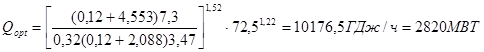 Уравнение (1.11) в силу принятых допущений носит весьма приближенный характер. Определим оптимальную мощность центрального теплового пункта для жилого массива города. 1. Плотность тепло потребления q =72,5 ГДж/(ч га). 2. Потребители подключены к тепловой сети по зависимой схеме α=7,3. 3. Прокладка теплопроводов канальная β=3,47. 4. Годовые отчисления от капитальных вложений на эксплуатацию φцтп=4,553 1/год , φс=2,088 1/год. 5. Коэффициент эффективности кап вложений Ен =0,12 1/год. В результате имеем