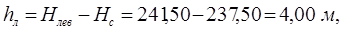 ![]() где Нв , Нн – отметки точек на горизонталях выше и ниже сооружения, м, соответственно равные 241,25 и 235,00; i в ,i н – расстояние по тальвегу от сооружения до верхней и нижней точки, м, соответственно равные 100,00 и 95,00. · Определяем глубину лога перед искусственным сооружением Из двух отметок правого и левого водоразделов по оси дороги выбираем наименьшую и определяем глубину лога по формуле (6.1[7]) или (6.2[7]). Так как отметка правого водораздела больше отметки левого водораздела: Нлев < Нпр (241,50<255,00), для определения глубины лога воспользуемся формулой (6.1[7]):