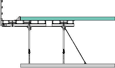 Рис.2 Плитовой модуль с системой безопасности включающий поручни и натяжной анкер В качестве элементов для установки в проектное положение и обеспечения устойчивости используют различные системы подкосов, снабжённые механическими домкратами. Опалубочный щит снабжается рабочей площадкой с ограждением. Для обеспечения пространственной жёсткости щиты объединяют инвентарными схватками и балками. Установку щитов ведут с помощью крана. При устройстве перекрытий большего пролёта используются промежуточные опоры из телескопических стоек, оснащённых механическими домкратными системами, устанавливаемые с шагом не более 2,8 м. На балки, устанавливаемые с заданным шагом, укладываются щиты опалубки, которые фиксируются к верхним поясам ригелей с помощью зажимов, и с помощью клиновых зажимов – между собой.