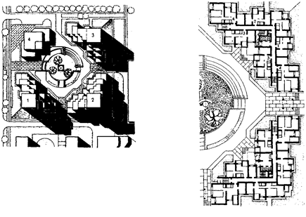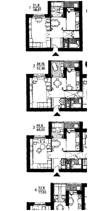 Данные о структуре населения по размеру семей служат исходными для выявления соответствующего состава типов квартир в доме, комплексе или застройке района, которые всегда находят отражение в заданиях на проектирование. Поэтому в каждом случае должна разрабатываться определенная номенклатура различных типов квартир с различным числом жилых комнат. Это и составляет одну из особенностей проектирования квартир для массового жилого строительства. Численный состав семьи таким образом - один из основных типообразующих признаков жилой ячейки. Именно числом человек, на которое рассчитывается квартира, определяется ее размер, общая и жилая площади. Жилую площадь квартиры составляет сумма площадей всех жилых комнат; общую - площади всех помещений квартиры. Жилая площадь на человека в настоящее время принята как основной показатель при распределении жилища, общая площадь квартиры служит основой при ее проектировании. Наряду с задачей обеспечения каждой семьи квартирой, существует необходимость создания всем проживающим в ней определенного и равноценного уровня комфорта. Эта задача глубоко демократического характера обязывает проектировщика при разработке квартир конкретной номенклатуры наделять их равноценными качествами. Ни одна квартира в проектируемом доме не должна быть ущемлена по отношению к другим. Равноценность квартир обеспечивается соответствующими планировочными приемами, единым уровнем гигиенических условий, санитарно-технического оборудования и всем тем, что может характеризовать степень комфортабельности проживания в жилой ячейке. В качестве примера, иллюстрирующего изложенную идею, можно указать на жилой комплекс в Калининграде, где все четыре типа квартир решены на развитии одного планировочного приема, при этом каждая квартира имеет остекленную веранду и лоджию при кухне. В следующих примерах также установлены относительно равные условия для организации быта и отдыха семей. Равноценность квартир, таким образом, второй принцип, их проектирования в массовом жилище. Этот принцип позволяет получить на каждом данном этапе жилищного строительства относительно стабильный уровень комфорта и равные условия проживания в квартирах. Хотя численный состав семей и основной типообразующий признак формирования жилых ячеек, но этого недостаточно. Необходим всесторонний учет требований, связанный с жизнедеятельностью семьи в своей квартире. Как известно, запросы различных семей могут быть различны. Даже в рамках семей одной численности требования проживающих к своей квартире могут не совпадать. Здесь проявят себя возрастные особенности, родственные связи членов семьи, социальный статус ее и каждого из ее членов - словом, что ни семья, то будет свой образ жизни. Проявят себя и определенные традиции, национальные особенности в организации быта. Все это говорит о том, что многообразие потребностей может оказаться непредсказуемым. Поэтому для проектирования квартир массового жилого строительства служат обобщенные научно-разработанные положения по функциональной организации, отражающие типичные и прогрессивные формы бытовой жизнедеятельности большинства семей. На основе их разрабатываются нормы и рекомендации по оптимальному использованию всех помещений квартиры. I. Жилой комплекс из двенадцат