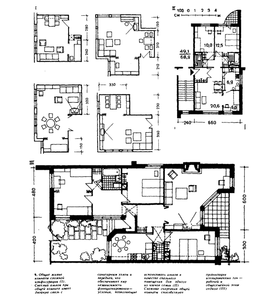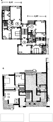 Во всех квартирах секции предусмотрены большие светлые передние с лоджиями при них (курсовой проект) МАрхИ) (а). Проходная общая комната — общий принцип планировочной организации всех квартир в доме (ФРГ) (б). Экономическим ограничителем проектирования квартир являются строительные нормы и правила, которые время от времени совершенствуются, отражая, с одной стороны, возможности государства, реализуемые в жилищном строительстве, а с другой - научные, типологические и гигиенические обоснования. В настоящее время действует СНиП 2.08.01-89 "Жилые здания". В них отсутствует регламентация на состав жилых, отчасти, и подсобных помещений, характерная для предшествовавших норм. Теперь он назначается проектировщиком, а увеличенные пределы общей площади квартир, явившиеся результатом повышения норм жилой площади на человека раскрывают широкие возможности для разработки качественно новых архитектурно-планировочных схем жилых ячеек. Увеличение размеров жилой ячейки и норм заселения еще не может гарантировать эксплуатационной полноценности жилища. Качество квартиры, уровень ее комфортабельности зависят от показателей использования помещений. Дело в том, что из всех жилых помещений квартиры комнаты, предназначенные для сна, а большей степени обусловлены демографическими и функциональными требованиями. Если двухместная спальня для супругов закономерна, то при размещении двух спальных мест в одном помещении, предназначаемых другим членам семьи, необходимо учитывать их пол, возраст и родственные связи. Исходя из условия, что все проживающие в квартире должны иметь возможность независимого удовлетворения своих потребностей в удобное для них время, становится очевидным, что то или иное размещение спальных мест по помещениям будет характеризовать и соответствующий уровень комфортабельности в жилой ячейке. В итоге это будет означать - как соотносится число членов семьи к числу комнат в квартире. Это соотношение принято выражать в виде формулы, в которой число жилых комнат в квартире обозначается буквой К, а число членов семьи - буквой Н. Общесоюзное жилищное законодательство не устанавливает единой нормы жилой площади на одного проживающего. В Основах жилищного законодательства СССР указывается, что "норма жилой площади устанавливается законодательством союзных республик в размере не менее 9 м на одного человека". Жилищным кодексом РСФСР норма жилой площади установлена в размере 12 мна человека, в Армянской ССР она составляет 9 м на человека, в УССР - 13,6 м на человека и т.д. Жилищное и жилищно-строительное законодательство. Справочное пособие. - М.: Стройиздат, 1986. Для квартир, проектируемых по норме жилой площади 9 м /чел. наиболее характерна формула расселения в виде К=Н-1, т.е. число жилых комнат в квартире уступает на одну единицу числу членов семьи. Например, двухкомнатная квартира, имеющая в своем составе спальню и общую комнату, заселяется семьей из трех человек. В квартирах же, предназначенных для крупных семей, как правило, проектируется не одна двухместная спальня, поэтому формула расселения может стать К-Н-2 и, даже К=Н-3. Значит, в этих условиях будет неизбежным размещение спальных мест во всех жилых, включая и общую, комнатах. Так и заселялось абсолютное большинство квартир прошедшего периода. С повышением нормы жилой площади д