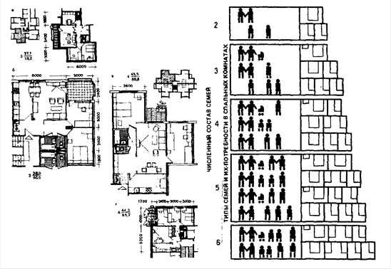 Таким образом, в отличие от жилища, проектируемого индивидуально, где возможно непосредственно учитывать требования конкретного заказчика, планировочная организация квартир для массового строительства ориентируется на анонимного потребителя. Это является существенной особенностью их проектирования. Оценить квартиру, убедиться в ее соответствии требованиям семьи можно только по истечении определенного времени, поскольку запросы как у семьи, так и отдельных ее членов не остаются постоянными. Они меняются вместе с закономерностями изменений в семье. Здесь выступает диалектическая суть взаимоотношения "жилая ячейка-семья", если первая по своей природе инерционна, статична, то семья всегда подвижна, изменчива, отсюда вытекает и закономерность изменений в формах эксплуатации жилища. Поэтому очень важно - насколько и как долго квартира сможет удовлетворять меняющиеся запросы проживающей в ней семьи. И когда наступает определенное несоответствие между ними, приходится констатировать, что квартира морально устарела. Необходимость максимального продления сроков ее морального износа - наиболее актуальная задача проектирования квартир, решение которой важно не только с точки зрения сохранения определенного уровня их комфортабельности, но и с точки зрения затрат на жилищное строительство. Глубокое понимание условий функционирования жилой ячейки с учетом различных изменений в требованиях со стороны семьи явится необходимой предпосылкой для ее качественного решения. Здесь будет иметь значение все: общие функционально-планировочные принципы организации квартиры, число, размер и пропорции помещений, возможность их трансформации, положение входов и оконных проемов, что во многом определит те или иные возможности для расстановки мебели, а значит вариантного использования каждого помещения. Словом, все, что будет способствовать продлению сроков амортизации жилой ячейки без снижения ее эксплуатационных качеств, должно найти отражение в разрабатываемых проектах квартир. Отсюда следует, что при разработке квартир для условий массового строительства, необходимо прогнозировать возможность реализации в них различных форм эксплуатации. Такое требование составляет еще одну из особенностей их проектирования. Вопросы экономики в строительстве массового жилища никогда не перестанут быть одними из важнейших принципов его проектирования. Что касается квартиры, то при ее формировании принцип экономики выступает в виде требования создания максимальных удобств и комфорта при предельно экономичном и рациональном использовании ее пространства. Этот принцип утверждается в процессе проектирования через систему показателей, характеризующих относительную экономичность квартир. Следует учесть, что возможности любых модификаций квартиры, предназначенной для определенного состава семьи, не могут решить проблему сохранения комфорта в случаях увеличения семьи на два человека. При этих обстоятельствах требуется смена квартиры.