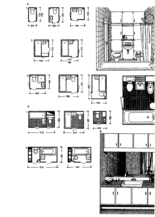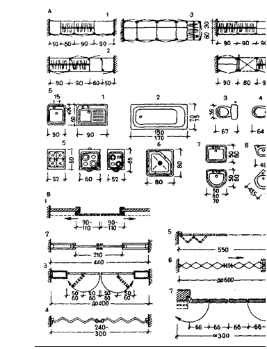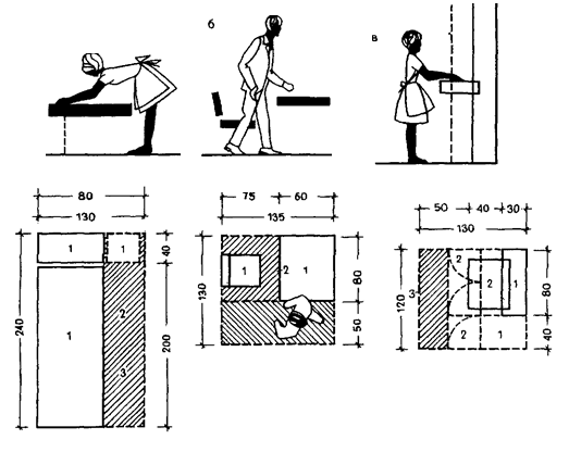 Оборудование помещений квартиры, предусматриваемое проектом А-типы встроенных шкафов и шкафных перегородок: 1, 2 - однорядные, 3 - двухрядные; 4 - смешанные; 5 - шкафная перегородка с дверным проемом. Б - оборудование сантехнических помещений: 1 - кухонные мойки; 2 - типы ванн; 3 - унитаз; 4 - биде; 5 - газовая и электроплиты; 6 - душевой поддон; 7 - прямоугольные и полукруглые умывальники; 8 - рукомойники. В - трансформирующиеся двери и перегородки: 1 - прямораздвижная дверь; 2 - щитовая перегородка с раздвижными двойными полотнами; 3 - остекленная раздвижная перегородка, убираемая в карманы; 4-шарнирно-складывающаяся перегородка из узких щитов; 5 - шарнирно-складывающаяся перегородка из широких пластин, 6 - легкая гармончатая перегородка из пластин; 7-наружные шарнирно-складывающиеся двери. Итак - зона бытового процесса - это пространство, в котором осуществляется тот или иной процесс жизнедеятельности, имеющее условные границы. Параметры пространства устанавливают на основе антропометрических и эргономических требований. В соответствии с этим предусматриваются: постановочная часть зоны, т.е. пространство, на котором размещается необходимая для данного процесса мебель, или иное оборудование; рабочая часть зоны - пространство, которое необходимо для открывания дверец шкафа, отодвигания кресел, стульев и пр.; резервная часть площади зоны - пространство для человека - как обязательное условие удобного осуществления бытового процесса. Использование зон в качестве расчетных элементов формирования помещений можно видеть на примерах рис.7, Б. Поскольку зоны обладают определенной самостоятельностью, их можно комбинировать и располагать различным образом относительно друг друга, но в соответствии с требованиями их функциональной взаимосвязи, освещения, привязки к стенам, месту окон и дверей в помещении. При необходимости возможно совмещение зон, но только в части резервных площадей. В любом случае должны сохраняться минимальные размеры между крайними предметами мебели соседних зон. Расчетный состав зон бытовых процессов на каждую квартиру устанавливается в соответствии с численностью семьи и уровнем жилищной обеспеченности.