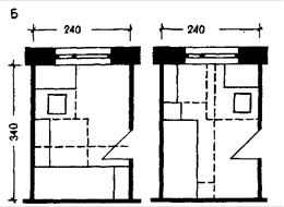 Столовая зона для удобного ее обслуживания располагается возле двери в кухню или раздаточного окна. Рабочая зона, как правило, размещается возле окна. На рис.8, б представлены варианты функционально-пространственной организации комнаты общесемейного отдыха и приема пищи. Следствием необходимых размеров зон при их взаимном положении явился и минимальный предел ширины общей комнаты - 3,2 м, что, в свою очередь, ориентирует на выбор конструктивного шага и пропорций помещения. Принято считать наиболее удобными жилые комнаты с соотношением ширины и глубины от 1: 1 до 1: 1,5. Близкие к квадрату по своим пропорциям помещения комнат эстетически и эргономически предпочтительней продолговатых, но последние при равной площади имеют больший периметр стен, следовательно, для размещения мебели и планирования зон бытовых процессов они имеют преимущества. Особенно это важно, когда существует необходимость в проходной общей комнате. В квадратном помещении при этом даже не удается полностью разместить весь необходимый набор мебели.
