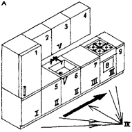 Комнаты с зоной приема пищи - не удовлетворяют в полной мере требования многих семей к зоне питания как к месту подлинного «семейного очага». По данным социологов 17,5% семей желали бы иметь одно помещение достаточной площади для размещения зоны приготовления пищи, столовой зоны и зоны общения (с установкой телевизора), рассчитанных на полный состав семьи. Подобные планировочные приемы встречаются в практике проектирования и строительства как у нас, так и за рубежом. Таким образом, возникла необходимость еще в одном типе помещения общесемейного пользования кухня-столовая-гостиная, который дополнит номенклатуру, представленную в Приложении 1. Наличие такого многофункционального помещения в квартире придаст ей качественно новые нетрадиционные черты. Функционально-планировочная организация кухонного помещения зависит, прежде всего, от его пропорций, габаритов, места дверных и оконных проемов, а также от принятой схемы расположения кухонного оборудования. В кухне удлиненной формы с окном на узкой стороне получило распространение однорядное расположение оборудования. При ширине кухни не менее 2,3 м возможна расстановка элементов под углом и двухрядная. Эти схемы отличаются компактностью и способствуют высвобождению свободного места для организации зоны приема пищи. Проектирование кухонь без прямого естественного света по современным нормам не допускается. Кухни, освещаемые вторым светом, могут найти оправдание в экономичных планировочных схемах домов с шириной корпуса не менее 15-17 м, проектируемых для холодных районов и Крайнего Севера. При этом кухню следует располагать за освещенной прямым естественным светом обеденной зоной общей комнаты, отделять ее светопрозрачной перегородкой с дверью и полностью остекленной верхней частью. Кухня в этих случаях оборудуется побудительной вентиляцией и электроплитой. Как показали социологические исследования, в большинстве случаев зона питания семьи - основное место ее пребывания в свободное от работы, учебы и личных индивидуальных занятий время. Вместе с тем у различных семей выявились различные требования к ее качественному решению и месту расположения по отношению к другим общесемейным зонам. Существующие два варианта размещения зоны питания: или в одном помещении с зоной хозяйственных работ, или в разных; II - подготовка сырья; Ш - приготовление пищи (4-шкаф для посуды и утвари, 7, 9 - рабочий стол, 8-плита); IV-обеденное место; V-мойка и сушка посуды. Санитарно-гигиенические помещения. В них организуются зоны личной гигиены, имеющие сугубо индивидуальный характер, поэтому они требуют условий строгой изоляции. В проектировании квартир используют четыре типа помещений, наиболее отработанных в функциональном отношении: ванная, душевая, уборная и смешанный тип - совмещенный санитарный узел. Каждый имеет ряд планировочных решений. Основными приборами, составляющими их оборудование в квартирах массового строительства, являются ванна, душевой поддон, умывальник, унитаз, рукомойник, в отдельных случаях - биде. Размеры помещений назначаются в зависимости от состава оборудования. Ванная комната по действующим нормам оборудуется ванной и умывальником, кроме того, в ней резервируется место для стиральной машины. Уборные проектируют двух типов: только с унитазом, если она размещает