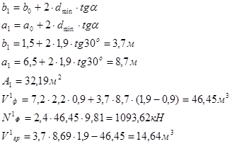 3.2 Определение минимальных размеров фундамента Необходимо устройство песчаной подушки А0 =6,5м B0 =1,5м Н0 =10,5м N1 =35210кН Т=270кН М=1760кНĦм а=а0 +2с b=b0 +2с с=0,2-0,5м А=аĦb VФ =аĦbĦdmin NФ =VФ Ħρб Ħq Р=∑N/A