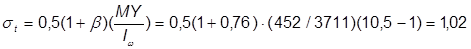 N/Fрасч + Mд /Wрасч = 215/1800 + 257×102 /27000 = 0,12 + 0,95 = 1,07 < 1,152 кН/м2 , т.е. прочность сечения обеспечена с запасом 8%.