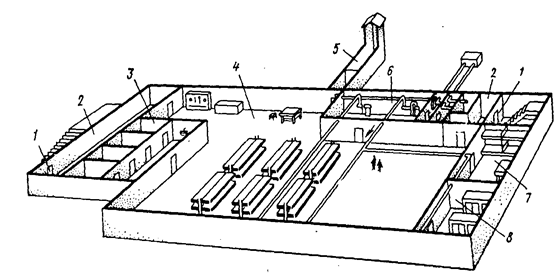 Рисунок 13.1. Схема основных помещений для укрываемых людей К основным относятся помещения для укрываемых людей 4, тамбуры, шлюзы 2, а к вспомогательным – фильтровентиляционные камеры 6, санитарные узлы 3, защищенные дизельные электростанции, входы 1 (тамбуры и предтамбуры) и выходы 5, медицинская комната 7, кладовая для продуктов 8. Помещения для размещения укрываемых рассчитываются на определенное количество людей: на одного человека предусматривается не менее 0,5 м2 площади пола и 1,5 м3 внутреннего объема. Высоту помещений убежищ принимают в соответствии с требованиями использования их в мирное время, но не менее 2,2 м от отметки пола до низа выступающих конструкций перекрытия (покрытия). Большое по площади помещение разбивается на отсеки вместимостью 50–75 человек. В помещениях (отсеках) оборудуются двух или трехъярусные нары–скамейки для сидения и полки для лежания. Расстояние от верхнего яруса до перекрытия или выступающих конструкций должно быть не менее 0,75 м. Помещения убежища, где располагаются укрываемые люди хорошо герметизируются для того, чтобы в них не проникал зараженный радиоактивными, отравляющими веществами и бактериальный средствами воздух. Этого можно достигнуть повышенной плотностью стен и перекрытий, заделкой в них всевозможных трещин отверстий и соответствующим оборудованием входов. Каждое убежище имеет не менее двух входов, расположенных в противоположных сторонах с учетом направления движения основных потоков укрываемых, а встроенное убежище должно иметь и аварийный выход. Входы в убежища оборудуются в виде двух шлюзовых камер (тамбуров), отделенных от основного помещения и перегороженных между собой герметическими дверями. Для убежищ вместимостью от 300 до 600 человек, устраивается однокамерный, а более 600 человек – двухкамерный тамбур-шлюз. Снаружи входа устраивается прочная защитно-герметическая дверь, способная выдерживать давление ударной волны ядерного взрыва. В убежищах устраивают аварийный выход. Он представляет собой подземную галерею сечением 90х130 см, выходящей на незаваливаемую территорию через вертикальную шахту, заканчивающуюся оголовком. Вход в галерею с наружной и внутренней сторон стены закрывают защитно-герметическими ставнями. Оголовок аварийного выхода должен быть удален от окружающих зданий на расстояние, составляющее не менее половины высоты зданий плюс 3 м. В каждой стене оголовка делают проем размером 0,6х0,8 м, оборудованный жалюзийной решеткой, открывающейся внутрь.