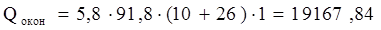 3). Тепловые потери через окна Площадь окон: Fокон =0,15·612=91,8 м2 . Коэффициент теплопередачи через одинарные окна согласно справочным данным примем k = 5,8 Вт/м2 ·К По формуле (7) рассчитываем теплоту, теряемую через окна: