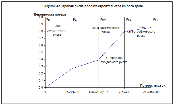 Вывод: Значение ЧД проекта, рассчитанное в п.1а по базисному варианту составит значение не 180-200 тыс.уде., а с учетом развития возможных сценариев (с учетом вероятности риска реализации проекта) ЧД составит 95 тыс.уде., что отличается примерно в два раза – в условиях деятельности на рынке Украины. Рассчитывается чистый дисконтированный доход ЧДД от инвестиций. а) процентная ставка на вложенный капитал примерно составит: ставка на привлекаемый капитал: 100 тыс.грн. : 600 тыс.грн. = 17%; ставка налогообложения (льготное): 20%; темп инфляции: 13%. Итого i = 17% + 20% + 13% = 50% : 100% = 0,5. б) с учетом фактора времени (при времени строительства равном 3 года) доходы от продажи квартир составят по годам Дг: 1 год Д1 = 500 тыс.грн. 2 год Д2 = 400 тыс.грн. б) с учетом фактора времени (при времени строительства равном 3 года) доходы от продажи квартир составят по годам Дг: 1 год Д1 = 500 тыс.грн. 2 год Д2 = 400 тыс.грн. 3 год Д3 = 200 тыс.грн. в) объем капитальных вложений (наиболее вероятный) составит 480 тыс.грн. г) чистый дисконтированный доход от инвестиций в жилье: ЧДД = 500 : (1 + 0,5) + 400 : (1 + 0,5)2 + 200 : (1 + 0,5)3 – 480 = 570,35 тыс.грн. – 480,0 тыс.грн. = 90,35 тыс.грн. Вывод: при нормальных рыночных условиях (наиболее вероятном сценарии) чистый дисконтированный доход проекта составит ЧДД = 90,35 тыс.грн., что близко соответствует значению чистого дохода, рассчитанному с учетом развития возможных сценариев ЧД = 95 грн.уде. 7. Устанавливаются оценочные показатели риска инвестиционного проекта: а) коэффициент риска при условии, что в проекте используется только капитал вкладчиков жильцов в сумме 480 тыс.грн., а максимальный уровень потерь при рискованном варианте реализации равен Пмах = -130 тыс.грн. – 45 тыс.грн. = - 175 тыс.грн. Кр = Пмах : КВс = 175 тыс.грн. : 480 тыс.грн. = 0,36, Пмах – максимальный уровень потерь, КВс – собственный капитал, который возможно использовать для покрытия потерь; б) математическое ожидание потерь, с учетом систематического риска b=0,5 по базовому варианту М(х) = (ЧДУКС + УД трест) * b: М(х) = (200000 + 180000) * 0,5 = 190000 грн. то же с учетом коэффициента риска проекта Кр = 0,36: М(х) = (200000 + 180000) * 0,36 = 1368000 грн. то же с учетом наступления каждого сценария с уровнем вероятности рi = 0,25 (табл. 3.1): М(х) = (200000 + 180000) * 0,25 = 95000 грн. в) принимая оптимистическую оценку потерь Оо = 95000, наиболее вероятную Онв = 136000, пессимистическую Оп = 190000, определяем ожидаемую оценку потерь: Оож = (Оо + 4*Онв + Оп) : 6 = (95000 + 4*136000 + 190000) : 6 = 138167 грн. Вывод: Данная оценка ожидаемого уровня потерь выше прогнозируемого уровня чистого дохода (прибыли) ЧД = 95000 грн., но ниже валового дохода проекта, составляющего Дв = 480000 грн., - показывает, что проект находится в зоне критического риска. Общие затраты на проект ИС = 280000 + 300000 = 580000 грн. (см. табл. 4.1). 8. Вычерчивается кривая риска проекта строительства многоквартирного дома