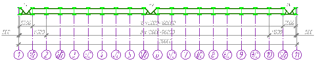 Рисунок 1. Схема расположения колонн и стропильных конструкцийСвязи между фермами, создавая общую пространственную жесткость каркаса, обеспечивают устойчивость сжатых элементов ферм, перераспределение местных нагрузок, приложенных к одной из рам, на соседние рамы, удобство монтажа, заданную геометрию каркаса, восприятие и передачу на колонны некоторых нагрузок. Система связей покрытия состоит из горизонтальных расположенных в плоскостях нижнего (рисунок 2) и верхнего пояса ферм (рисунок 3) и вертикальных связей (рисунок 4). Горизонтальные связи состоят из продольных и поперечных.