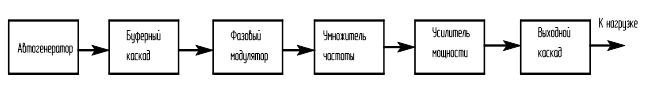 Кварцевые генераторы могут иметь выходную мощность до 10 мВт, отсюда следует вывод о том, что коэффициента усиления умножителей частоты достаточно и дополнительного усилителя мощности не требуется. На рис.3 приведена окончательная структурная схема передатчика.