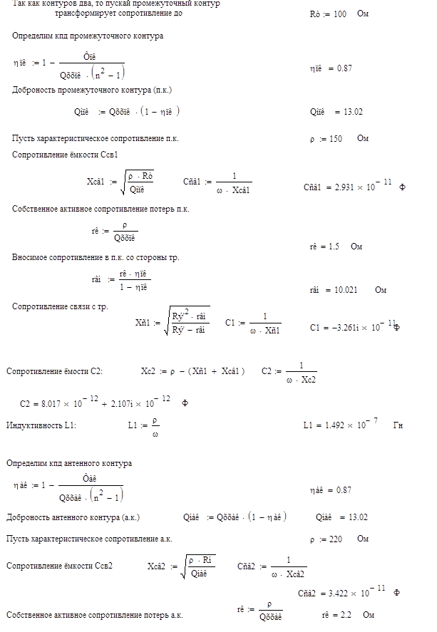 В качестве цепи согласования применим П-фильтр. Из [3] известно, что одноконтурная цепь согласования (ЦС) способна обеспечить фильтрацию (при КПД=0.8 и Qхх