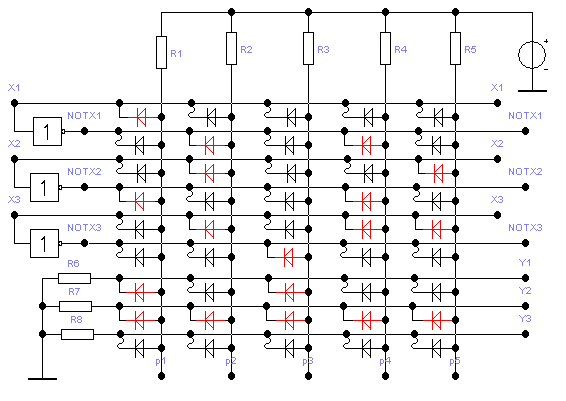 Основными параметрами ПЛМ является: · число входов m (xi); · число термов l (Pi); · число выходов n (yi). В общем случае: ПЛМ реализует дизъюнктивную нормальную форму воспринятых функций. ПЛМ способно реализовать n логических функций от m аргументов, содержащую не более l термов. Наиболее простой способ программирования ПЛМ – это пережигание перемычек. Упрощенное изображение ПЛМ. Вместо