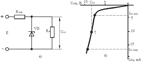 Рисунок 3.12 Работу схемы в данном режиме можно объяснить так. Поскольку Rогр постоянно и падение напряжения на нем, равное (Е − Uст), также постоянно, то и ток в Rогр, равный (Iст + Iн.ср), должен быть постоянным. Но последнее возможно только в том случае, если ток стабилитрона I и ток нагрузки Iн изменяются в одинаковой степени, но в противоположные стороны. Например, если Iн увеличивается, то ток I на столько же уменьшается, а их сумма остается неизменной. Принцип действия стабилитрона рассмотрим на примере цепи, состоящей из последовательно соединенного источника переменной ЭДС – е, стабилитрона VD и резистора R (рис. 3.13, а). В положительный полупериод на стабилитрон подается обратное напряжение, и до величины напряжения пробоя стабилитрона все напряжение прикладывается к стабилитрону, так как ток в цепи равен нулю. После электрического пробоя стабилитрона напряжение на стабилитроне VDостается без изменений и все оставшееся напряжение источника ЭДС будет приложено к резистору R. В отрицательный полупериод стабилитрон включен в проводящем направлении, падение напряжения на нем порядка 1В, а оставшееся напряжение источника ЭДС приложено к резистору R.