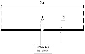 2a – длина вибратора t – величина зазора d – толщина вибратора Под воздействием ЭДС генератора в вибраторе возникают продольные электрические токи, которые распределяются по его поверхности таким образом, что создаваемое ими электромагнитное поле удовлетворяет уравнениям Максвелла, граничным условиям на поверхности проводника и условию излучения на бесконечности. Вследствие осевой симметрии электрические токи на боковой поверхности проводника вибратора имеют только продольные составляющие, а на торцевых поверхностях – радиальные составляющие. На цилиндрической поверхности радиуса d/2, затягивающей зазор вибратора, наряду с фиктивными продольными электрическими токами существуют также фиктивные азимутальные магнитные поверхностные токи, эквивалентно заменяющие внутреннюю область зазора вместе с возбуждающим генератором. С развитием различных радиотехнических систем и усложнением решаемых ими тактико-технических задач возрастают требования к антенным характеристикам, и в ряде случаев они становятся противоречивыми и совсем неразрешимыми при попытке разработать новые антенны по аналогии с существующими ранее и находящимися в эксплуатации. Например, стремление увеличить дальность действия и точность определения угловых координат в радиолокации приводит к требованию увеличения направленности антенн, что вызывает увеличение их размеров и масс. Увеличение скоростей полета летательных аппаратов приводит к необходимости увеличения скорости движению луча в пространстве. Совместить требования увеличения направленности и скорости движения луча в антеннах с механическим сканированием не представляется возможным из-за инерционности их конструкции. Подобное противоречия возникают и при попытках обеспечить одновременно высокую направленность и требуемые частотные, энергетические и пеленгационные характеристики. Эти обстоятельства заставляют отказываться от антенн традиционного типа для данного класса радиосистем и переходить к антенным решетках. Применение сложных антенн в виде решеток, состоящих из систем слабонаправленных или направленных излучателей, значительно расширяет возможности реализации требуемых характеристик. Система излучателей с электрически управляемым фазовым распределением – фазированная антенная решетка – осуществляет электрическое сканирование луча в пространстве со скоростью, которая может быть на несколько порядков выше скорости механически сканирующих антенн. Время установки в заданную точку пространства луча ФАР практически определяется быстродействием электрического фазовращателя или временем перестройки частоты при частотном сканировании и не связано с массой и с размерами антенны. Вибраторные излучатели в ФАР обычно располагаются над плоской проводящей поверхностью, играющей роль экрана и предотвращающей обратное излучение. Теоретические и экспериментальные исследования показывают, что наиболее существенно на характеристики вибраторного излучателя в составе антенной решетки влияют два фактора: размещение излучателей в решетке и положение их относительно проводящего экрана. Уменьшение шага решетки приводит не только к подавлению высших дифракционных максимумов, но и позволяет улучшить согласование в широком секторе углов сканировании. Изм