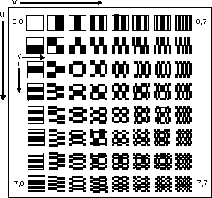де v – горизонтальна координата графічного блоку, u – вертикальна, x – вертикальна координата усередині блоку, а у – горизонтальна координата усередині блоку, C(u), C(v)= 1/ для u, v = 0 і З(u), З(v)= 1 інакше. Два члени в квадратних дужках є ядрами перетворення, показаними нижче на рис. 2, а p (x, y) є піксельними даними блоку реального малюнка. Початок координат в обох випадках у верхньому лівому кутку. Процес кодування зводиться до розбиття зображення на блоки 8*8 пікселів і виконанню процедури двомірного DCT для кожного з цих блоків. Отримані коефіцієнти перетворення дискретизують. 64 числа, що характеризують рівень сигналу, перетворюються на 64 коефіцієнти перетворення (амплітуди просторових частот), які добре піддаються процедурі стискування. Діськретізатор округляє коефіцієнти, ця процедура вносить деякі помилки, але зворотне перетворення на приймаючій стороні за рахунок усереднювання частково усуває спотворення, що вносяться. На практиці дискретизатор реалізує декілька складніший алгоритм. Інтуїтивно метод DCT базується на виявленні того, наскільки вищестоящий блок відрізняється від нижчестоячого. Для реального представлення (стискування) коефіцієнтів перетворення тут також використовуються коди Хафмана.
