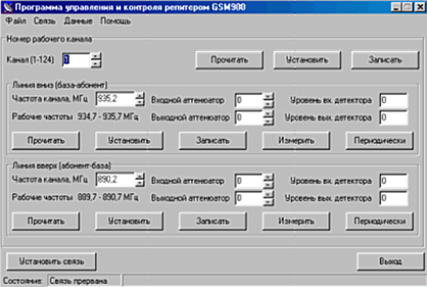Питание и потребляемая мощность: 12В, 18Вт (1.5А). Побочные уровни излучений - согласно рекомендаций GSM для базовых и мобильных станций Общая характеристика ретранслятора Repeator_GSM 1.0 : оперативная установка рабочей частоты, усиления и его контроль оператором посредством компьютера через интерфейс RS-232 с помощью внешней управляющей программы в дружеском диалоге под Windows. Ретранслятор имеет всепогодное исполнение и предназначен для установки как в помещениях, так и на открытом воздухе ( защиты корпуса IP66) при температуре окружающего воздуха от -40....С до +50..С . Управляющая программа