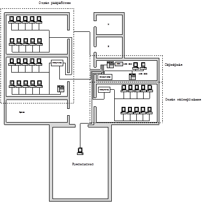 Рис. 3. Физическая модель локальной сети. Вся сеть организации разделяется на три подсети. Каждая подсеть в свою очередь может состоять из нескольких сегментов. Первая подсеть сети – это группа разработчиков. Она состоит из 20 рабочих станций и сервера рабочей группы. Все хосты этой подсети объединены коммутатором, который соединен с маршрутизатором сети. Вторая подсеть – это группа тестирования. Структура этой подсети аналогична предыдущей. Третья подсеть включает в себя АРМ руководства, администраторов, сервер. Такая структура сети легко может быть расширена. Для этого достаточно подключить новую подсеть к маршрутизатору и настроить сетевые адреса для нее. После разработки структуры сети необходимо выбрать тип кабельной системы, используемой в сети. Сеть строится на основе стандарта 100BASE-TX. Стандарт 100BASE-TX определяет сегмент Ethernet на основе неэкранированных витых пар (UTP) категории 3 и выше с топологией пассивная звезда (Twisted-Pair Ethernet). Данный тип сегмента Ethernet имеет все преимущества и недостатки пассивной звезды. Суммарное количество кабеля, необходимого для объединения такого же количества компьютеров, оказывается гораздо больше, чем в случае шины. С другой стороны, обрыв кабеля не приводит к отказу всей сети, монтаж, а также диагностика неисправности сети проще. В сегменте 100BASE-TX передача сигналов осуществляется по двум витым парам проводов, каждая из которых передает только в одну сторону (одна пара – передающая, другая – принимающая). Кабелем, содержащим такие двойные витые пары, каждый из абонентов сети присоединяется к концентратору (хабу). Концентратор производит смешение сигналов от абонентов для реализации метода доступа CSMA/CD, то есть в данном случае реализуется топология пассивная звезда. Так как характеристики сети удовлетворяют требованиям для использования витой пары в качестве сетевой среды, то выбрана был кабель UTP категории 5Е 24AWG. Кабели имеют стандартные разъемы RJ-45. 3. Выбор сетевого оборудования Одной из наиболее ответственных задач при проектировании сети является выбор сетевого оборудования, так как при этом необходимо обеспечить необходимые характеристики сети и избежать лишних материальных затрат. Перечень используемого оборудования приведен в приложении А. Самым дорогим компонентом сети является сервер. Сервер должен выполнять несколько функций. Обеспечивать резервное копирование данных. Поддерживать СУБД для хранения эталонов программ Обработка действий с файлами, находящимися на его носителях. Выполнять функцию маршрутизации данных в сети. Так же в сети используется proxy-сервер, для выхода в internet. Данный сервер имеет реальный ip-адрес, который используется хостами сети для выхода в глобальную сеть. Функции, выполняемые данным сервером, сводятся к обработке электронной почты, подмене локальных адресов хостов реальным ip-адресом. Вследствие этого, он не отличается высокой производительностью и по своей архитектуре близок к стандартному АРМ. Данный сервер введен в сеть исходя из целей безопасности. Если ограничиться лишь одним сервером, и возложить на него помимо вышеописанных функций еще и функции по взаимодействию с глобальной сетью, то он станет уязвим к внешним атакам, так как содержит всю важнейшую информацию организации и является одной из основных целей атак злоумышленников. Исх