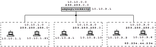 Рис. 4. Структура адресов сети. Сеть организации имеет адрес 10.10.0.0, соответственно, маска сети 255.255.0.0. Первая подсеть имеет адрес 10.10.1.0 и маску 255.255.255.0. Вторая подсеть имеет адрес 10.10.2.0 и маску 255.255.255.0. Адрес третьей подсети 10.10.3.0, маска подсети 255.255.255.0. Маршрутизатором является сервер, который входит в подсеть 10.10.3.0. Маршрутизатор имеет адрес 10.10.3.1. В подсети 10.10.3.0 есть proxy-сервер. Реальный IP-адрес этого сервера, используемый для выхода в Интернет локальными хостами 85.234.44.234. Таблица маршрутизации приведена в таблице 2.