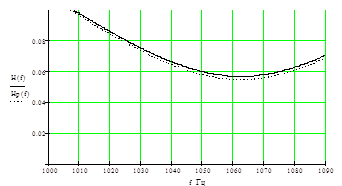 рис.3 Для того чтобы было видно различие между заданными и реальными зависимостями можно рассмотреть небольшие участки графиков АЧХ и ФЧХ (рис.4 и рис.5)