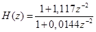 Таким образом, при ручном просчете программы, для крайнего случая, переполнения не произошло. Машинный расчет дает такое же значение выходного отсчета. Отсюда можно сделать вывод, что в процессе выполнения программы переполнения не происходит. 6.Составление и описание электрической принципиальной схемы устройства: Принципиальная электрическая схема цифрового режекторного фильтра содержит следующие элементы: 1) Микросхемы: DD1 – МП К1821ВМ85 DD2 – ПЗУ К1821РФ55 DD3 – ОЗУ К1821РУ55 DA1 – ЦАП К572ПА1 DA2 - ОУ К157УД3 DA3 – ОУ К157УД3 2) Диоды: VD1 – КД520 VD2-VD5 – КД514А 3) Конденсаторы C1,C4,C5 – КМ-56-П33 С2,С3 - К50-24 4) Резисторы R1,R2,R3,R4 5) Кварцевый резонатор ZQ1 – 3МГц Микросхемы DD1 – МП К1821ВМ85;DD2 – ПЗУ К1821РФ55; DD3 – ОЗУ К1821РУ55 образуют микропроцессорную систему, DA1 – ЦАП К572ПА1 преобразует выходной двоичный код процессора в аналоговый сигнал в виде тока, VD2-VD5; C2,C3,С4,С5; R3,R4; DA2, DA3 образует схему преобразования ток/напряжение, VD1;R1,R2; C1 образуют схему сброса, кварцевый резонатор задает тактовую частоту процессора. На выходе схемы преобразователя ток/напряжения формируется напряжение от -1 до +1 В, это обеспечивается подачей опорного напряжения на ЦАП Uref=-1В. Устройство использует питающие напряжения +5, -15 и +15 В, а также напряжение, для подачи опорного напряжения -1В. 7.Расчёт быстродействия устройства: Быстродействие фильтра в рабочем режиме оценим как время, необходимое для обработки каждого прерывания процессора. Рабочая программа фильтра линейная (не содержит разветвлений), поэтому общее число машинных тактов, требуемых для выполнения программы, получим как сумму машинных тактов всех последовательно выполняемых команд, составляющих рабочий цикл процессора. Сумма машинных тактов для рабочего цикла приведенной выше программы равна 445 . Из этого следует вывод, что процессор не успеет выполнить подпрограмму обслуживания прерывания за интервал дискретизации TД . При частоте FCLK МП = 1,5 МГц TД = 353ТCLK МП (353 машинных тактов процессора). Поэтому тактовая частота процессора должна быть увеличена. Примем FCLK МП = 3 МГц, что для заданной БИС МП допустимо,тогда TД = 706ТCLK МП . 8. Расчет АЧХ и ФЧХ устройства для заданных и реальных значений коэффициентов. Оценка устойчивости устройства: Исходя из разностного уравнения фильтра, можно записать выражения для передаточной функции устройства.