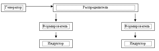 Рисунок 6 – Структурная схема МТА "Полюс-101". МТА "Полюс-2" предназначен для воздействия синусоидальным пульсирующим МП с 4-я ступенями регулирования интенсивности частоты импульсов МП. В комплект аппарата входят 3 типа индуктора цилиндрический (110x60 мм), прямоугольный (55x40x175 мм), внутриполостной (25x165 мм), индуктор-соленоид (240x265x150 мм). Цилиндрический индуктор выполнен в виде 4-х отдельных катушек с сердечниками, размещенными по периметру индуктора. Отличительной особенностью аппарата является автоматическое согласование интенсивности магнитного поля индуктора при его смене с генератором и наличие формирователя импульсов МП, позволяющего получать экспоненциальную форму тока в цепи индуктора с регулировкой времени сп (рис.7).