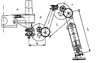 В нижней части конечности находятся три датчика усилия для измерения реакции силы ноги. Основные характеристики шагающего аппарата: · высота корпуса – 10 см; · длина стороны – 17 см; · общая масса – 21 кг; · размер конечности – 45,6 см; · масса конечности – 2.8 кг; · масса корпуса с микропроцессором – 3,8 кг; · скорость – около 0,4 км/ч; ·полезная нагрузка – 5 кг; · длина бедра – 20,4 см; · длина голени – 25,2 см; · поверхность касания конечности – 28,3 см2 3 Технические расчеты Попытаемся произвести некоторые расчеты движения руки, ее координирования и различных сил действующих на нее. Таким образом, вычисления во время рабочего режима при каждом периоде выборки включают в себя только вычисление сил и моментов, развиваемых приводами, но не включает преобразований из декартовой системы координат в пространство присоединенных переменных. Следовательно, возможно увеличение частоты выборки. Пусть положение системы координат описывает однородная матрица Н(t), размерностью (4x4):