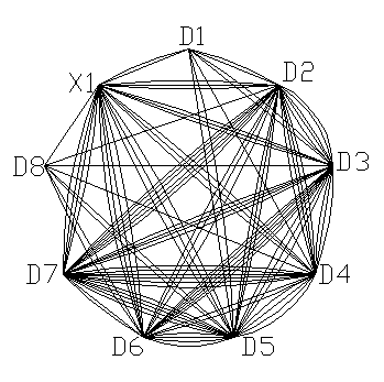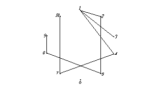 где dij – элемент матрицы расстояний. Общее суммарное расстояние от закрепляемого элемента к закрепленным будет минимальным. Проверяем, не является ли данная позиция областью, запрещенной для размещения элементов. Производим закрепление элемента Ni за свободной позицией ряда, в которой обеспечивается минимальное приращение функции цели. Проверяем все ли элементы размещены на плате, если нет, то процесс повторяется заново. 2.2 Выполнение размещенияПо графу (рис.4) строим матрицу смежности и определяем степень каждой вершины Таблица 10