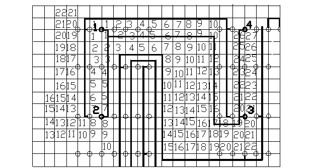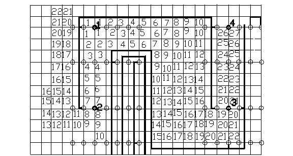 4. Трассировка сигнальных цепей с помощью волновых алгоритмовОсновные принципы построение трасс с помощью волнового алгоритма сводятся к следующему. Все ячейки монтажного поля подразделяются на занятые и свободные. Занятыми считаются ячейки, в которых уже расположены проводники, построенные на предыдущих шагах, или находятся монтажные выводы элементов, а также ячейки, соответствующие границе плат и запрещенным для прокладывания проводников участкам. Каждый раз при проведении новой трассы можно использовать лишь свободные ячейки, число которых по мере проведения трасс сокращается. На множестве свободных ячеек коммутационного поля моделируют волну влияния из одной ячейки в другую, соединяемых впоследствии общим проводником. Первую ячейку, в которой зарождается волна, называют источником, а вторую - приемником волны. Чтоюы иметь возможность следить за прохождением фронта волны влияний, его фрагментом на кождом этапе присваивают некоторые веса: Рк = Рк-1 + Р, (12) где Рк и Рк-1 –веса ячеек К-го и (К-1)-го фронтов; Р–числовая характеристика, зависящая от выбранного критерия отимизации. На Рк накладывают одно ограничение – веса ячеек предыдущих фронтов не должны быть больше весов ячеек последующих фронтов. Фронт распространяется только на соседние ячейки, которые имеют с ячейками предыдущего фронта либо общую сторону, либо хотя бы одну общую точку. Процесс распространения волны продолжается до тех пор, пока её расширяющийся фронт не достигнет приемника или на i-ом шаге не найдётся ни одной свободной ячейки, которая могла бы быть включена в очередной фронт, что соответствует случаю невозможности проведения трассы при заданных ограничениях. Если в результате распространения волна достигла приемника, то осуществляют ‘проведение пути’, которое заключается в движении от приемника к источнику по пройденным на этапе распространения волны ячейкам, следя за тем, чтобы значение волны монотонно убывало. В результате получают путь, соединяющий эти две точки. Из описания алгоритма следует, что все условия необходимые для проведения пути закладываются в правило приписания веса ячейкам. Пример трассировки сигнальных цепей по волновому алгоритму. Требуется соединить контакты 1,2,3 и 4. Волну будем распространять из первого контакта рис.10.