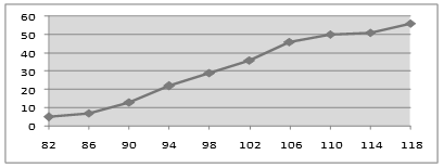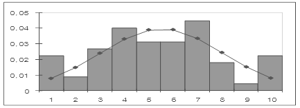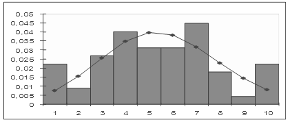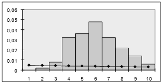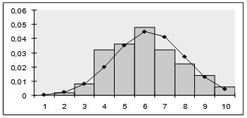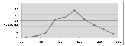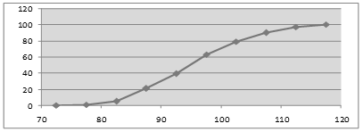 Рисунок 9 – Полигон частот кумуляты частот – графическая зависимость накопленных частот (накопленных относительных частот) от середины интервалов (рисунок 10).