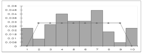 В ячейках В20:В29 вычислим плотности относительных частот как частное от деления относительных частот (ячейки F25:F34) на шаг (ячейка $F$22) из таблицы 10. Плотности равномерного, нормального, экспоненциального и гамма-распределений рассчитываются в соответствии с формулами: С20 = ЭКСПРАСП (А20;$B$5;ЛОЖЬ); D20 = НОРМРАСП (А20; $B$12; $B$13; ЛОЖЬ); E20 = ГАММАРАСП (А20; $B$16; $B$17; ЛОЖЬ). F20 = ЕСЛИ(А20<$B$8; 0; ЕСЛИ(A20>=$B$9; 1/($B$9-$B$8); 0)); Затем копируем их в блок ячеек С21:F21. После чего строим гистограмму частот, совмещенную с плотностью каждого из указанных ранее распределений. Графическое изображение гистограммы кривых различных распределений приведены на рисунках 11- 13.